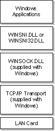PCSNI can only be used from Windows PCi applications (for example, RealLink for Windows). The dynamic link library WINSNI.DLL provides the interface between these and the Windows Sockets DLL as shown in the diagram.
